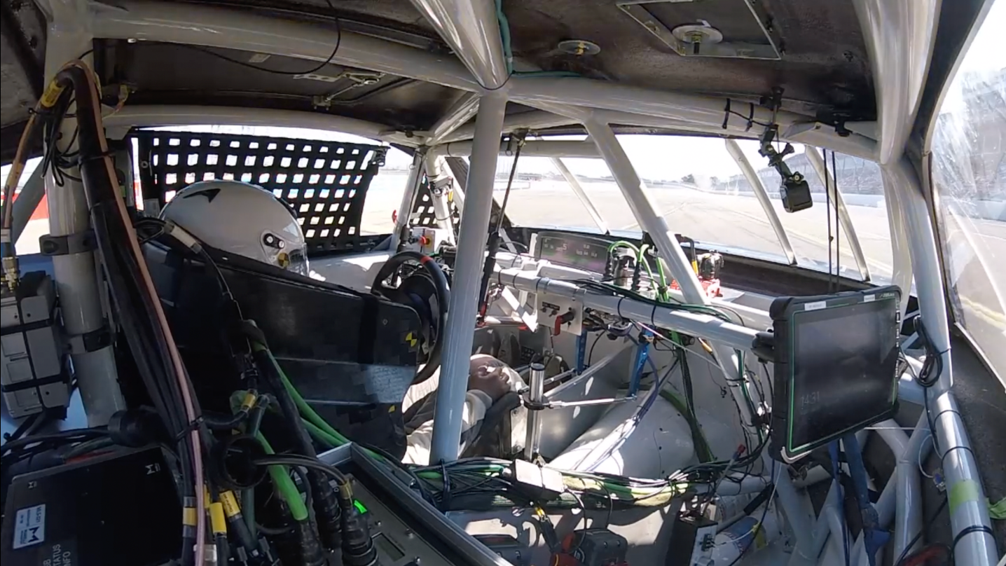 The Talladega setup consisted of NASCAR’s Hybrid III 50th Percentile Male frontal dummy with internal DTS data acquisition. There were dummy sensors, tri-axial accelerometers on the chassis as well as offboard cameras. The team spent two days slowly building up the crash test path at Talladega. They first ran three-quarters of the path with a last-minute, high-speed turn away from the steel and foam energy reduction (SAFER) barrier to avoid premature damage to the expensive Next Gen prototype.