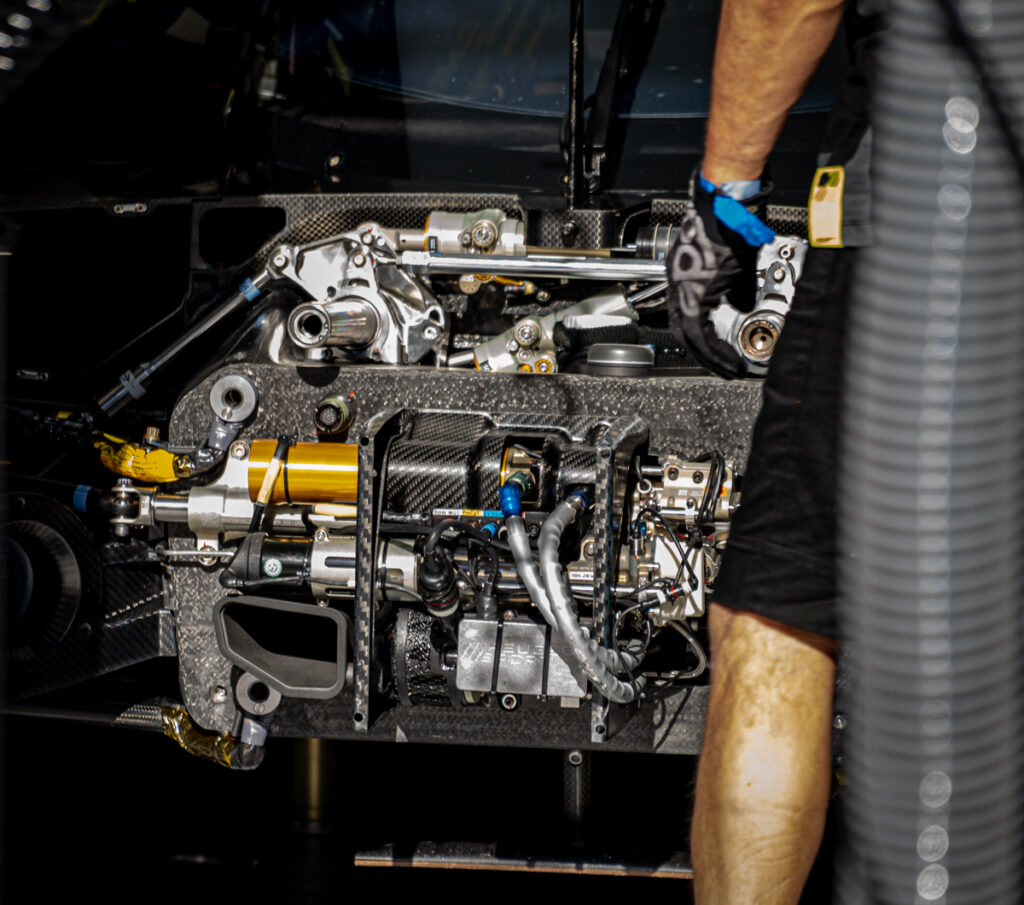 The 9X8 runs what Jansonnie said is an entirely in-house-developed powertrain, consisting of a twin-turbocharged, 2.6-liter direct-injection V6, married to a 200kW front-mounted electric motor-generator. As per the LMH rules, total output of the powertrain is limited to 500kW regardless of the combination of ICE and hybrid used (the rules had initially stated an output of 580kW but this was dropped to help alignment with the LMDh rules).