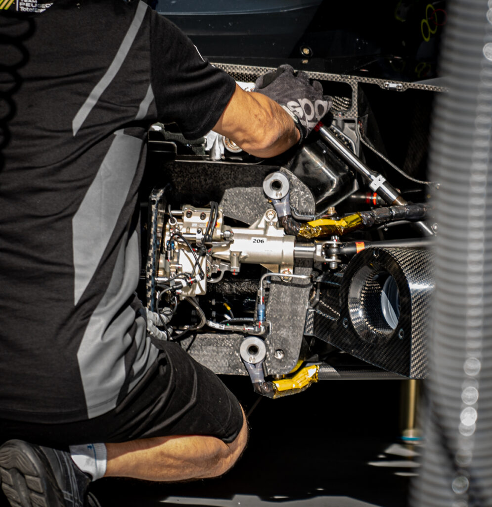 “It’s a very difficult exercise and you have to plan well in advance of homologation,” pointed out Jansonnie. While not willing to divulge its exact weight balance, Jansonnie suggested that the car was designed from the outset to run equally sized tires all around (31/71 x 18), as was specified by the rules for hybrid cars when Peugeot commenced work. The entire concept therefore centered around making these tires work, which he said requires a near 50:50 weight distribution. However, the rules were later changed to allow 29/71 front and 34/71 rear tires, which Toyota took advantage of with its reworked GR010 in 2022. Clearly, the use of a larger rear tire benefits both grip and wear over a stint.