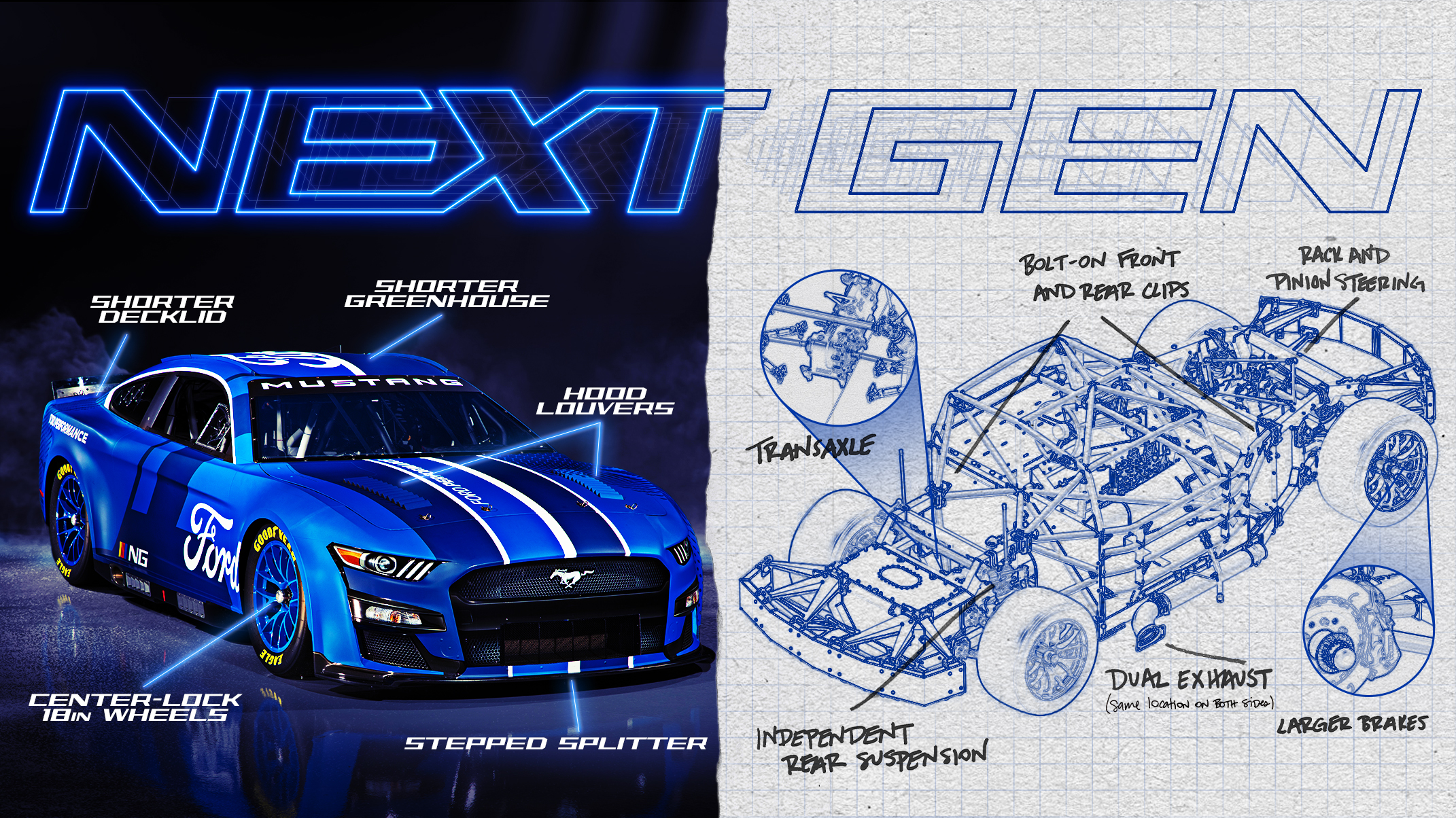 The current generation of pushrod V8 engines are retained, but with some modifications to suit the new package, including revised oil pans and exhaust systems. The latter will now utilize two exits, one either side of the vehicle, instead of the single right-side exit of the current cars. Power will be set at between approximately 550 bhp and 670 bhp depending on track type. There are no immediate plans to downsize the engines; however, the OEMs and NASCAR are open to future developments, including hybridization. To this end, the Xtrac-supplied transaxle already can incorporate a motor generator unit (MGU).