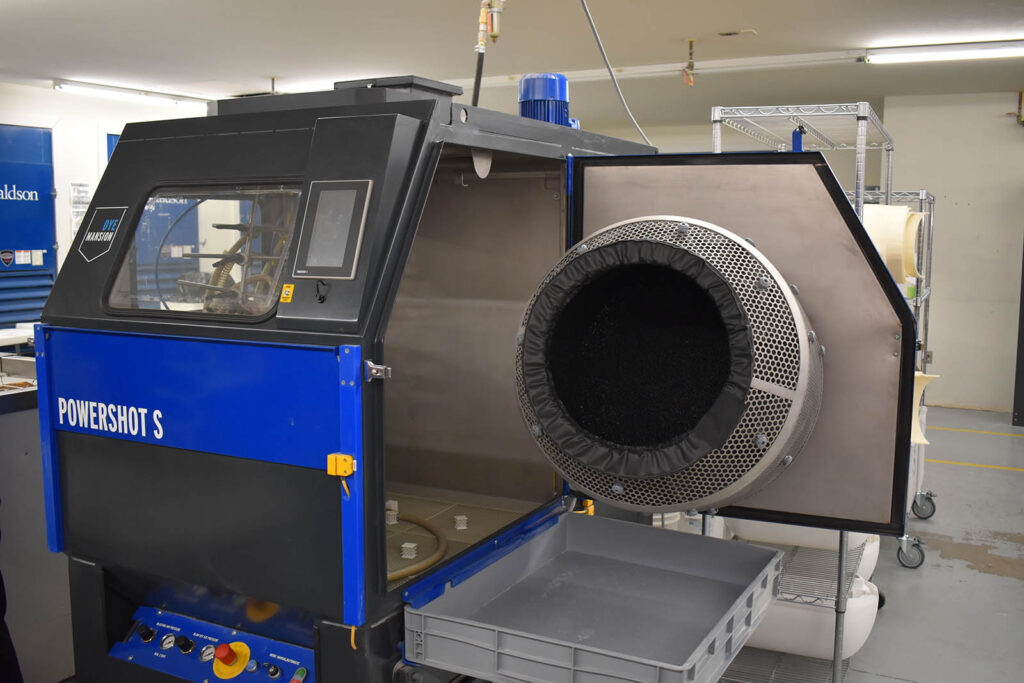 The nearby breakout room is where the freshly baked ‘part cakes’ are broken apart to reveal the newly additive-manufactured parts within. The process here is a mixture of manual intervention and automation, with compressed air and small media introduced to help clean the part up. Jeff Washburn, director of manufacturing at Belton, notes that more automation is possible with SAF components.